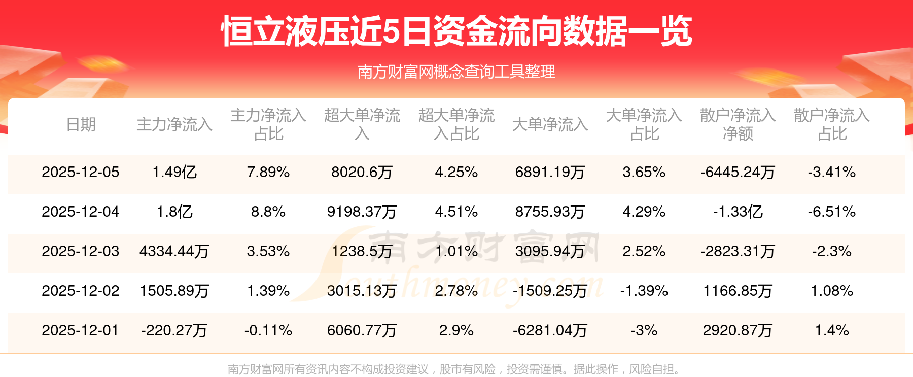 12月5日消息,恒立液压资金净流入1.49亿元,超大单资金净流入8020.6万元,换手率1.27%,成交金额18.89亿元。