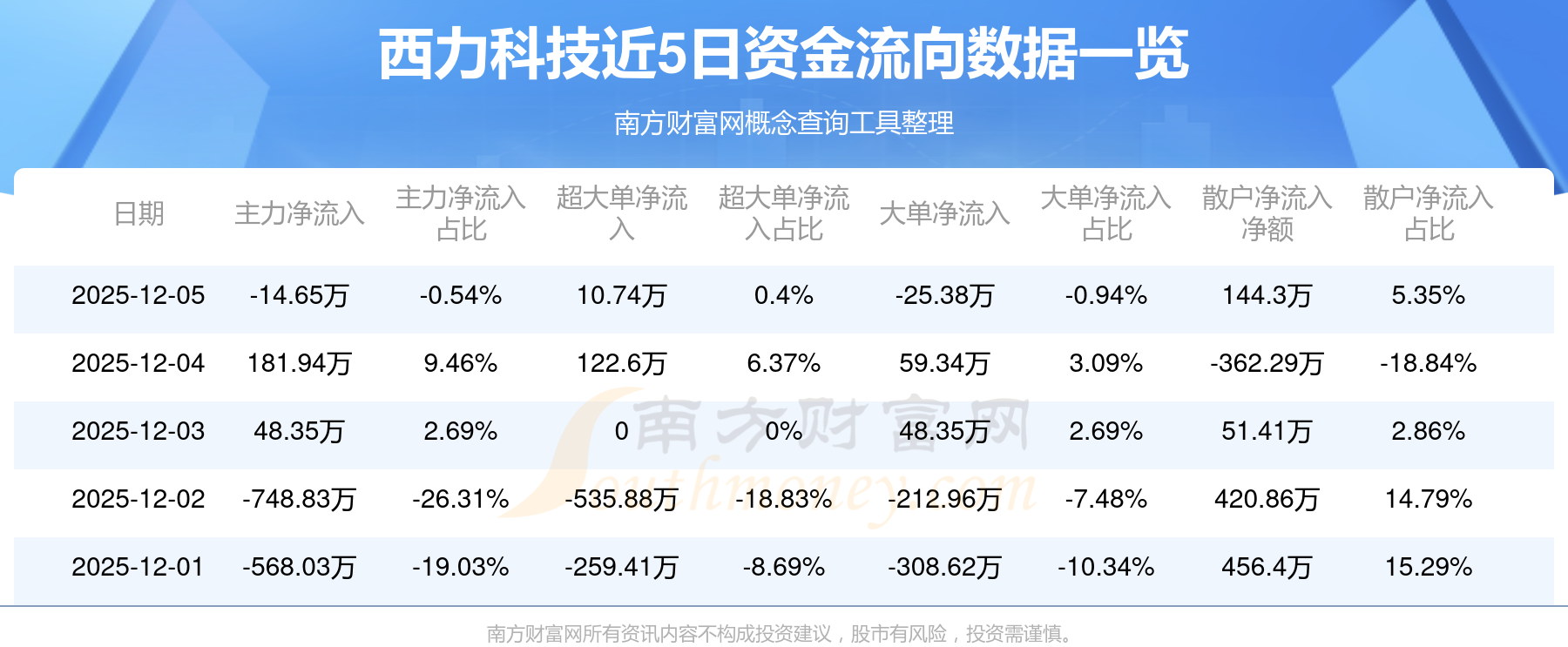 12月5日消息,西力科技主力净流出14.65万元,超大单净流入10.74万元,散户净流入144.3万元。