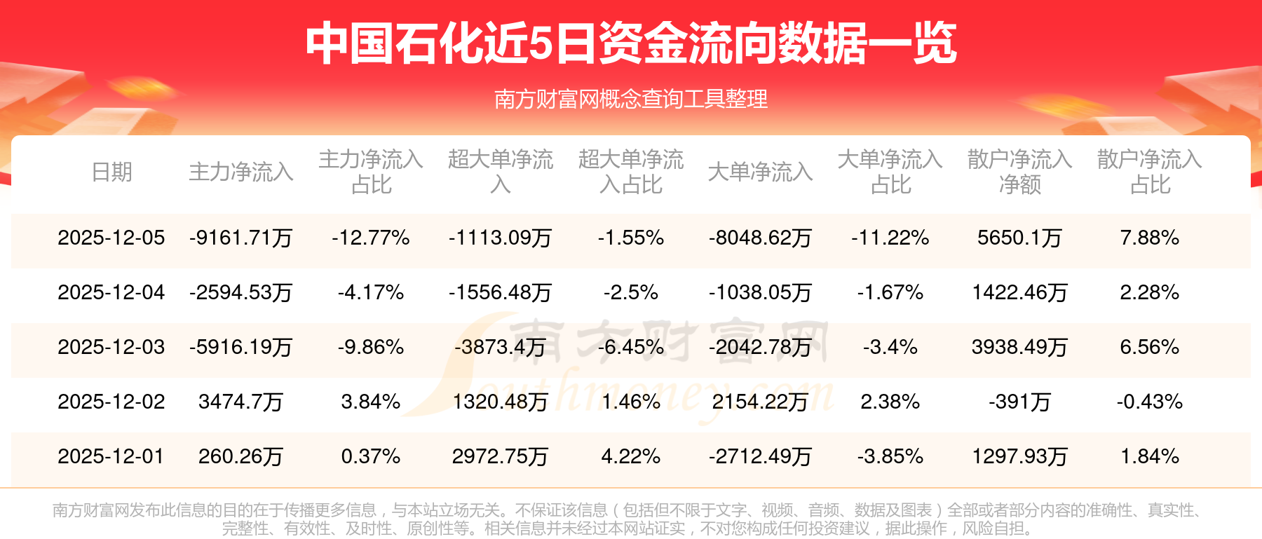 12月5日消息,中国石化12月5日主力资金净流出9161.71万元,超大单资金净流出1113.09万元,大单资金净流出8048.62万元,散户资金净流入5650.1万元。