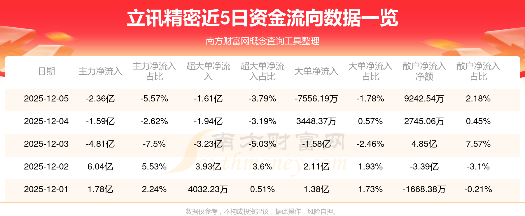 12月5日消息,立讯精密12月5日主力净流出2.36亿元,超大单净流出1.61亿元,大单净流出7556.19万元,散户净流入9242.54万元。