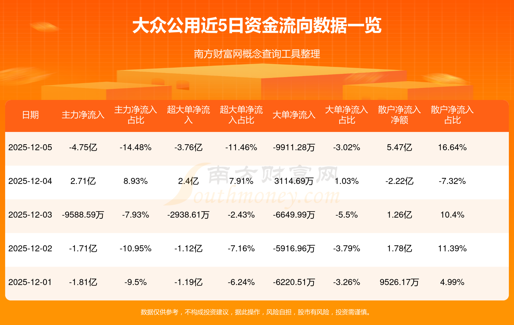 12月5日消息,大众公用资金净流出4.75亿元,超大单净流出3.76亿元,换手率17.86%,成交金额32.85亿元。