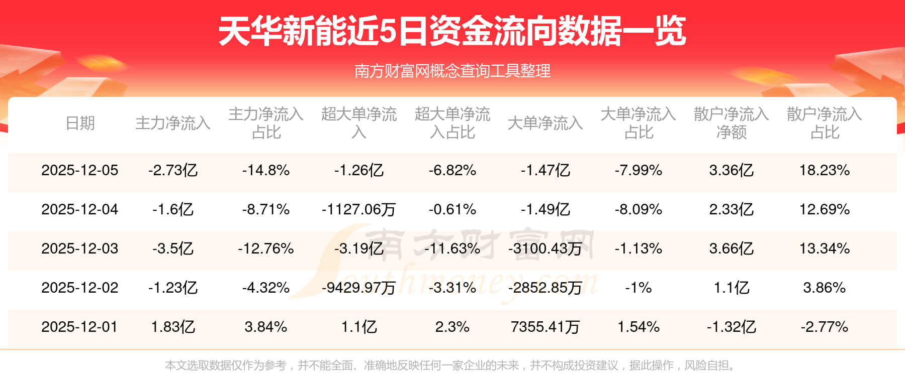 12月5日消息,天华新能主力净流出2.73亿元,超大单净流出1.26亿元,散户净流入3.36亿元。