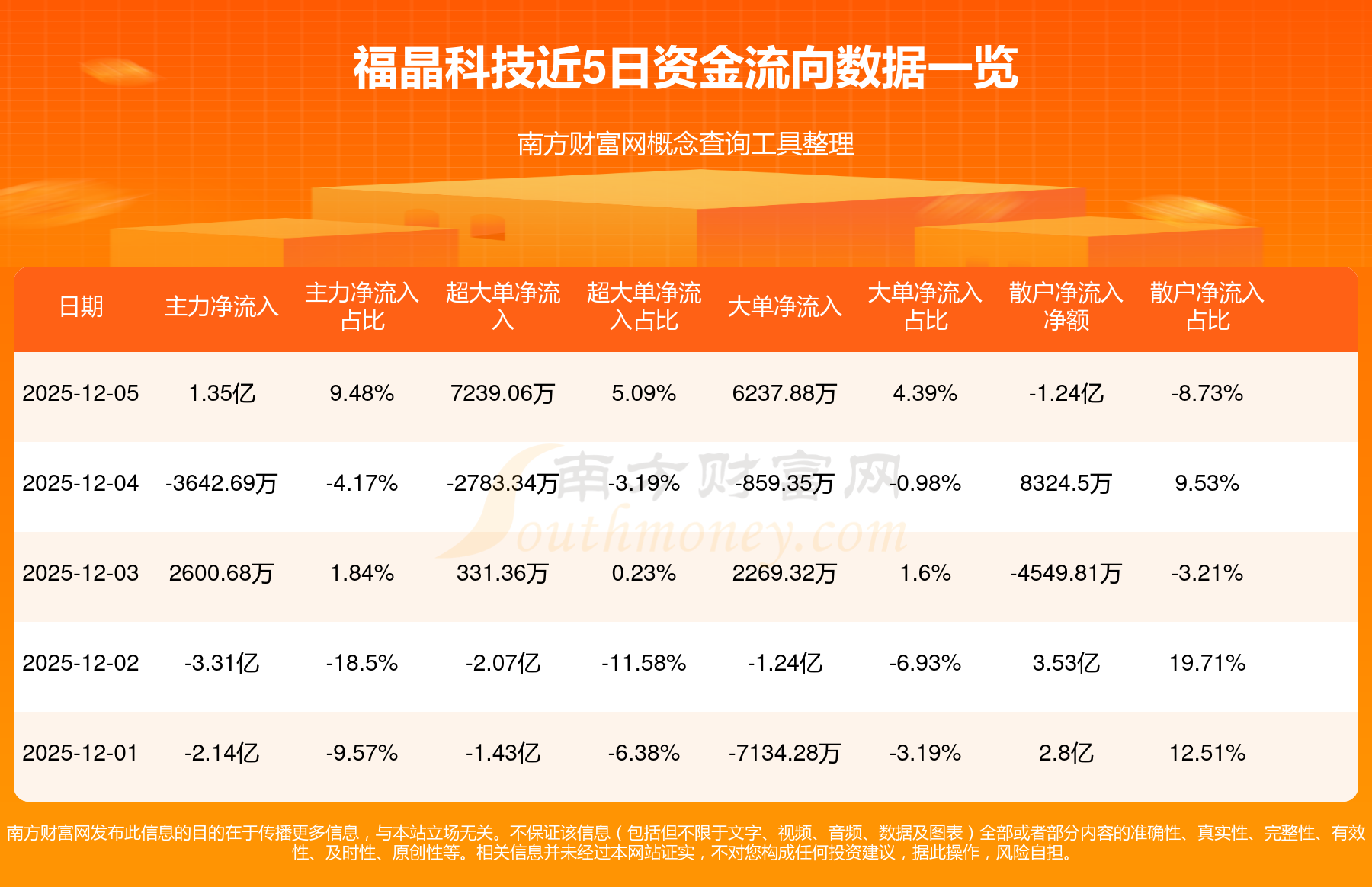 12月5日消息,福晶科技主力资金净流入1.35亿元,超大单资金净流入7239.06万元,散户资金净流出1.24亿元。