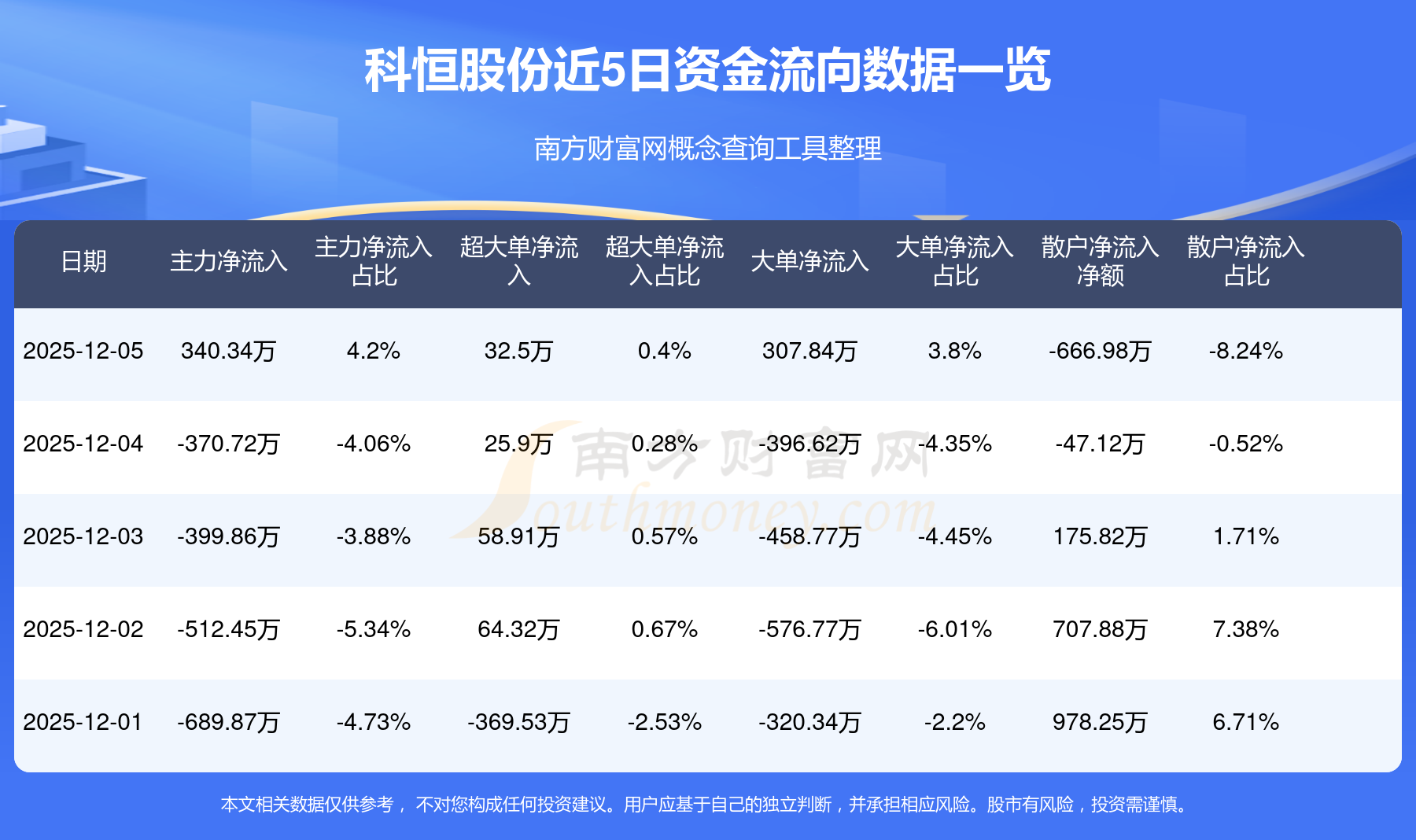 12月5日消息,科恒股份主力资金净流入340.34万元,超大单资金净流入32.5万元,散户资金净流出666.98万元。