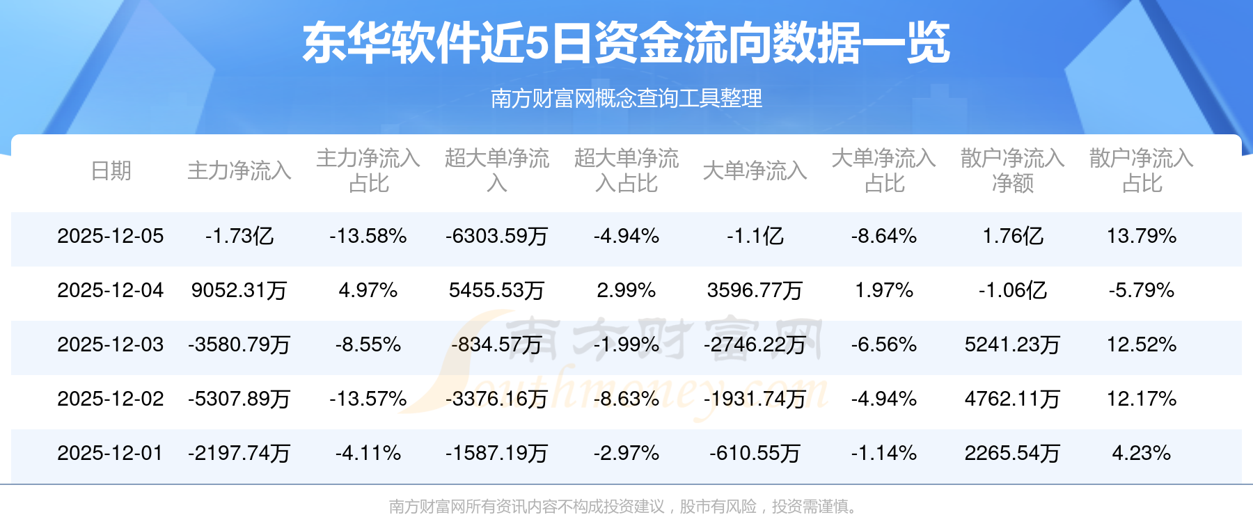 12月5日消息,东华软件12月5日主力资金净流出1.73亿元,超大单资金净流出6303.59万元,大单资金净流出1.1亿元,散户资金净流入1.76亿元。