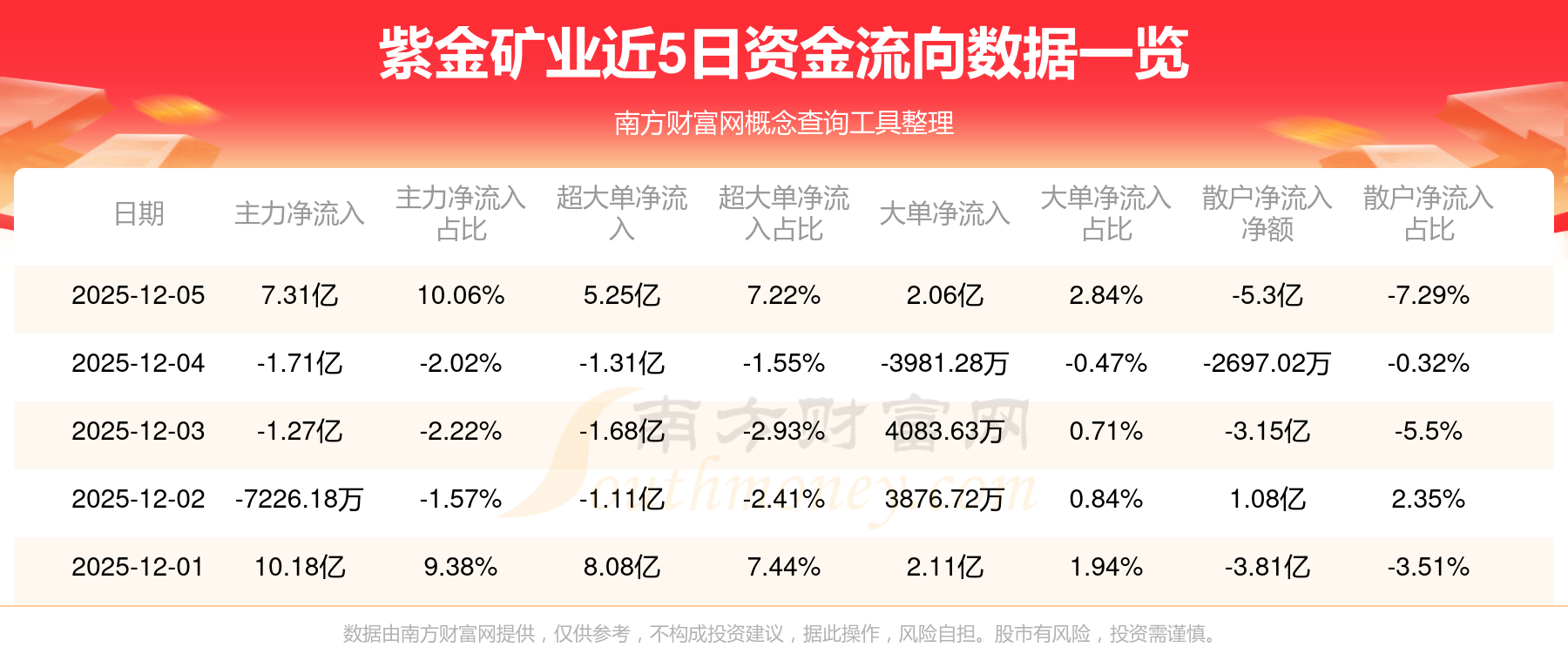 12月5日消息,紫金矿业主力资金净流入7.31亿元,超大单资金净流入5.25亿元,散户资金净流出5.3亿元。