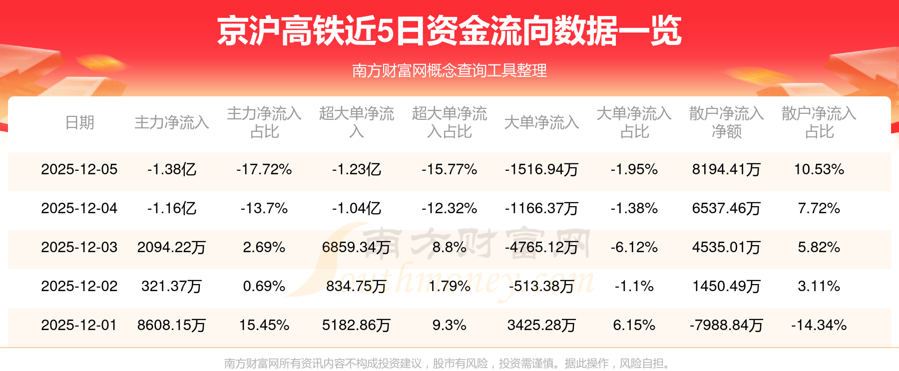 12月5日消息,京沪高铁主力净流出1.38亿元,超大单净流出1.23亿元,散户净流入8194.41万元。