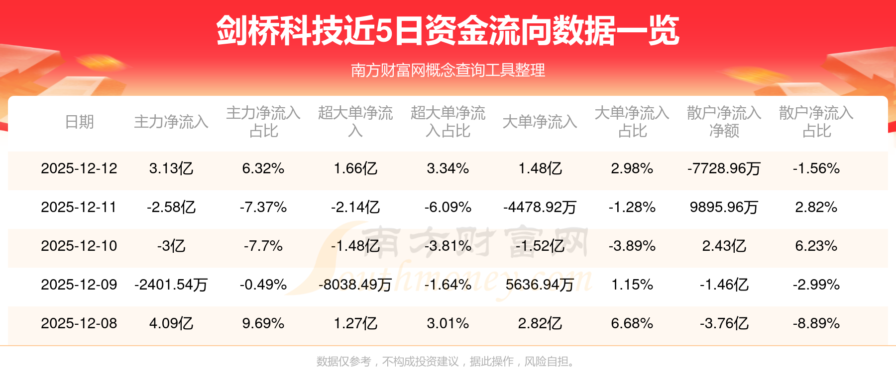 12月12日消息,剑桥科技主力净流入3.13亿元,超大单净流入1.66亿元,散户净流出7728.96万元。