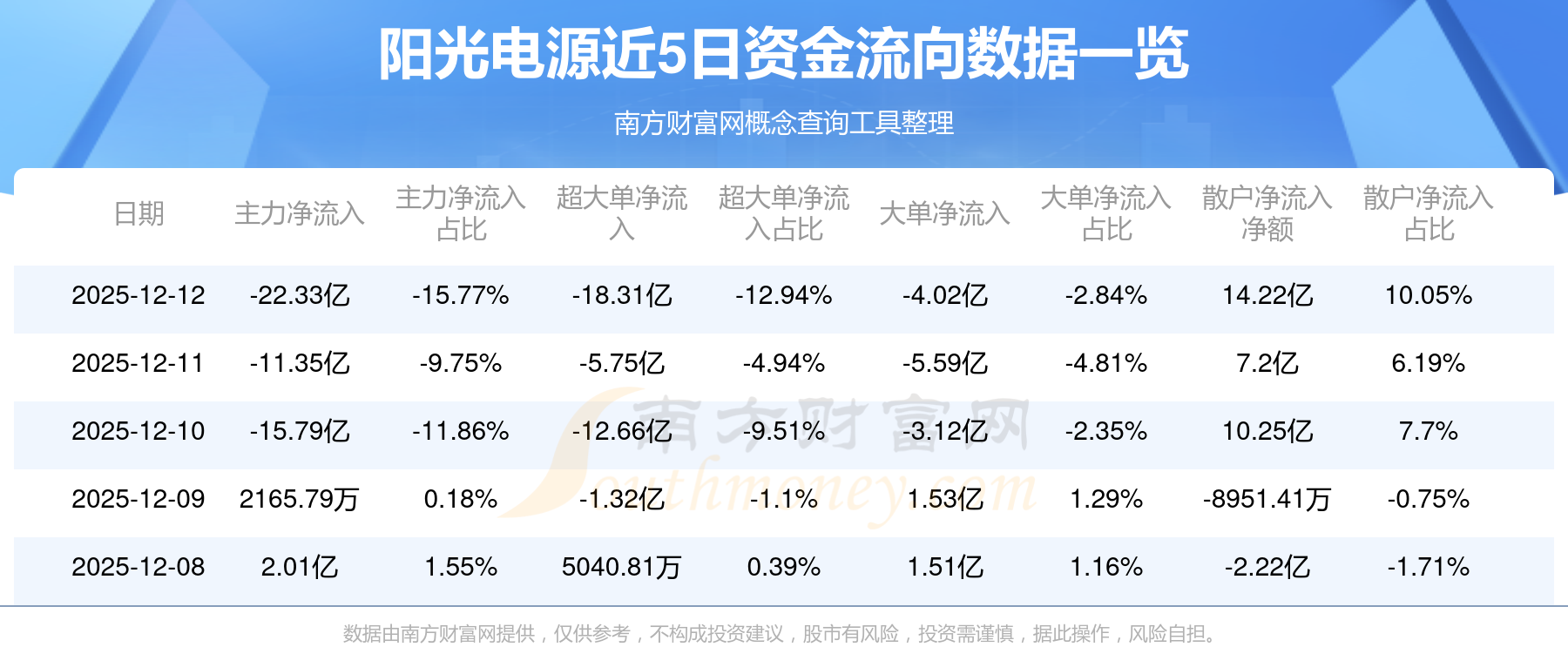 12月12日消息,阳光电源主力资金净流出22.33亿元,超大单资金净流出18.31亿元,散户资金净流入14.22亿元。