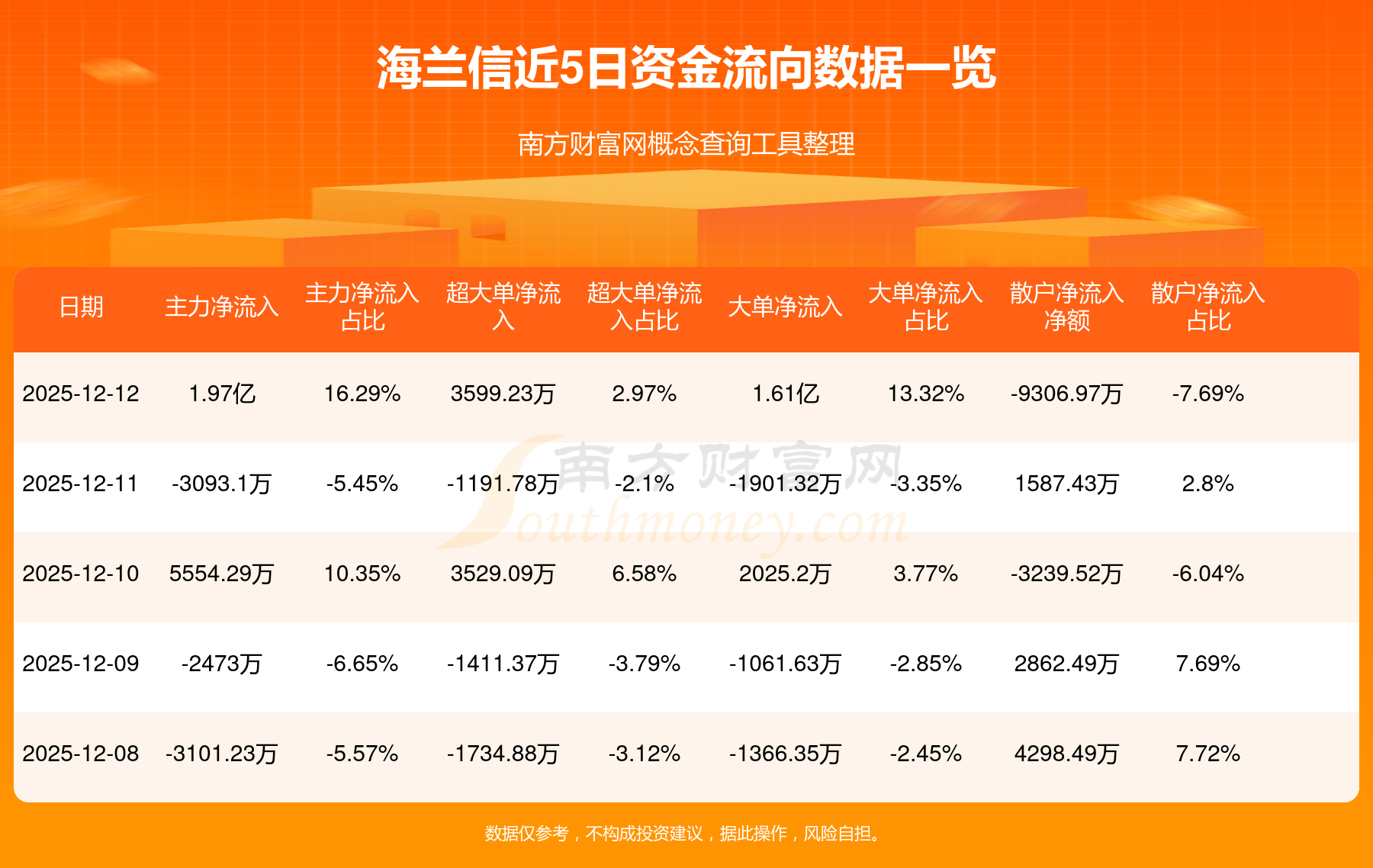 12月12日该股主力净流入1.97亿元,超大单净流入3599.23万元,大单净流入1.61亿元,中单净流出1.04亿元,散户净流出9306.97万元。