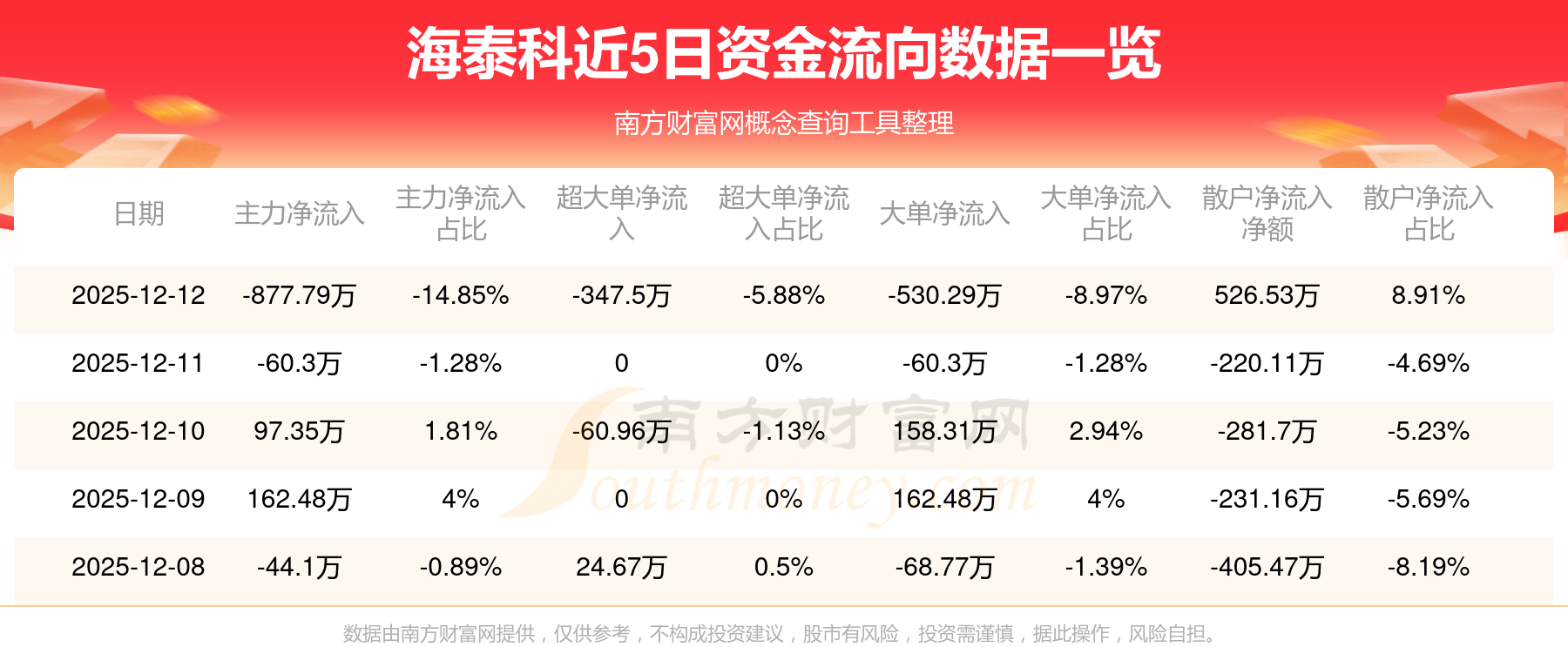 12月12日消息,海泰科主力净流出877.79万元,超大单净流出347.5万元,散户净流入526.53万元。