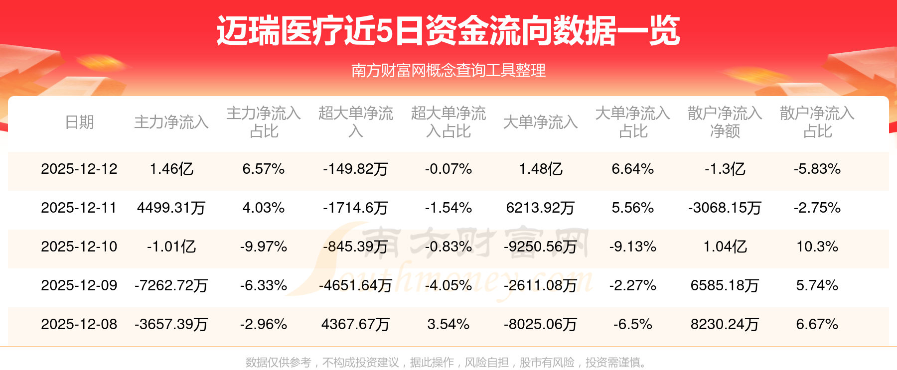 12月12日消息,迈瑞医疗资金净流入1.46亿元,超大单净流出149.82万元,换手率0.55%,成交金额13.28亿元。