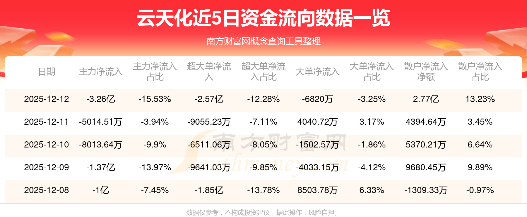 12月12日消息,云天化12月12日主力净流出3.26亿元,超大单净流出2.57亿元,大单净流出6820万元,散户净流入2.77亿元。