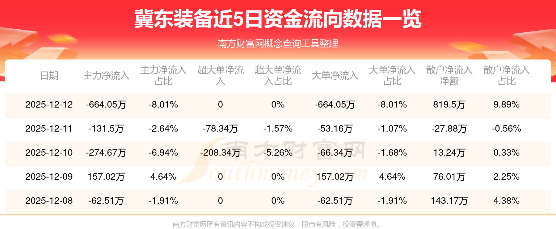 12月12日消息,冀东装备主力资金净流出664.05万元,散户资金净流入819.5万元。