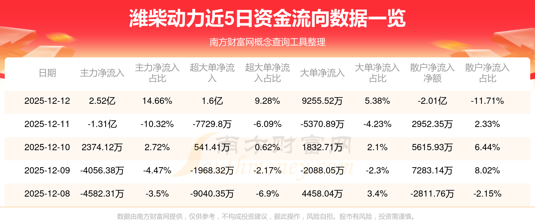 12月12日消息,潍柴动力主力资金净流入2.52亿元,超大单资金净流入1.6亿元,散户资金净流出2.01亿元。
