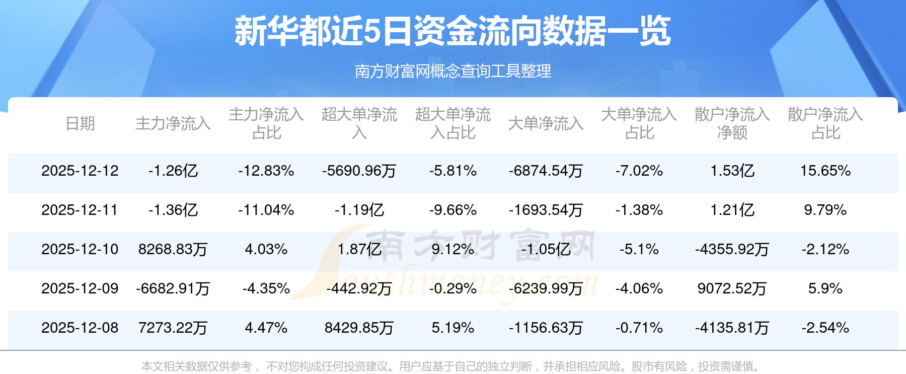 12月12日消息,新华都资金净流出1.26亿元,超大单资金净流出5690.96万元,换手率12.39%,成交金额7.28亿元。