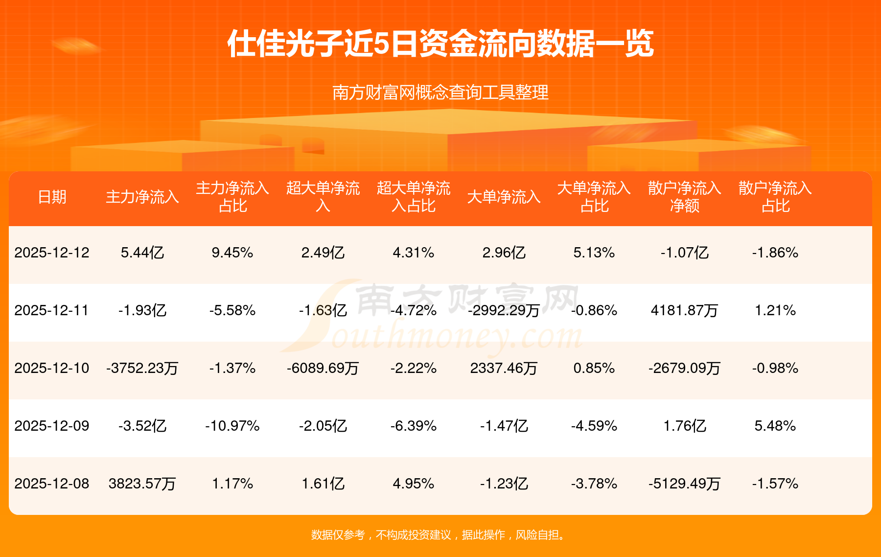 12月12日消息,仕佳光子主力资金净流入5.44亿元,超大单资金净流入2.49亿元,散户资金净流出1.07亿元。