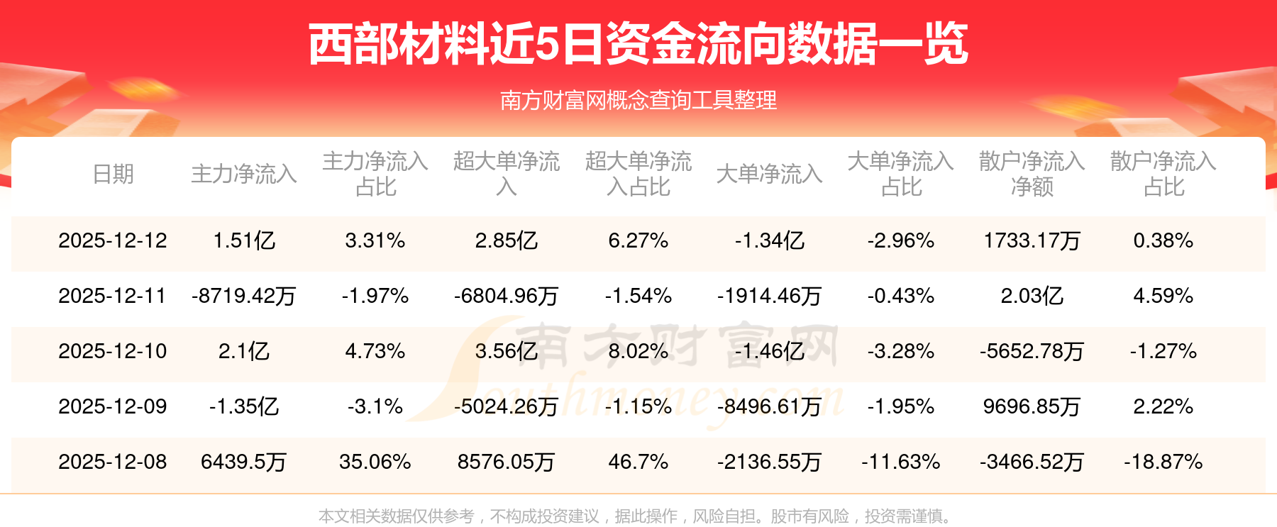 12月12日消息,西部材料12月12日主力净流入1.51亿元,超大单净流入2.85亿元,大单净流出1.34亿元,散户净流入1733.17万元。