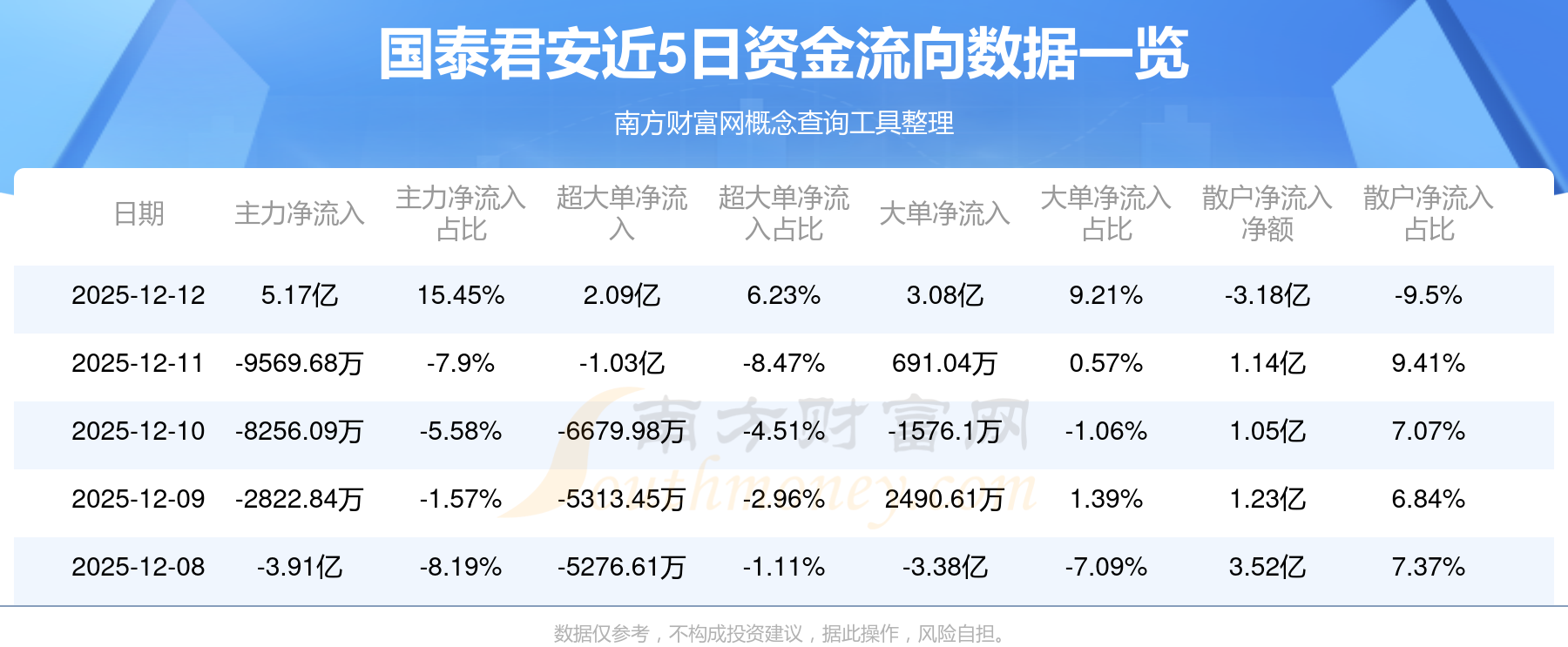 12月12日消息,国泰君安12月12日主力资金净流入5.17亿元,超大单资金净流入2.09亿元,大单资金净流入3.08亿元,散户资金净流出3.18亿元。