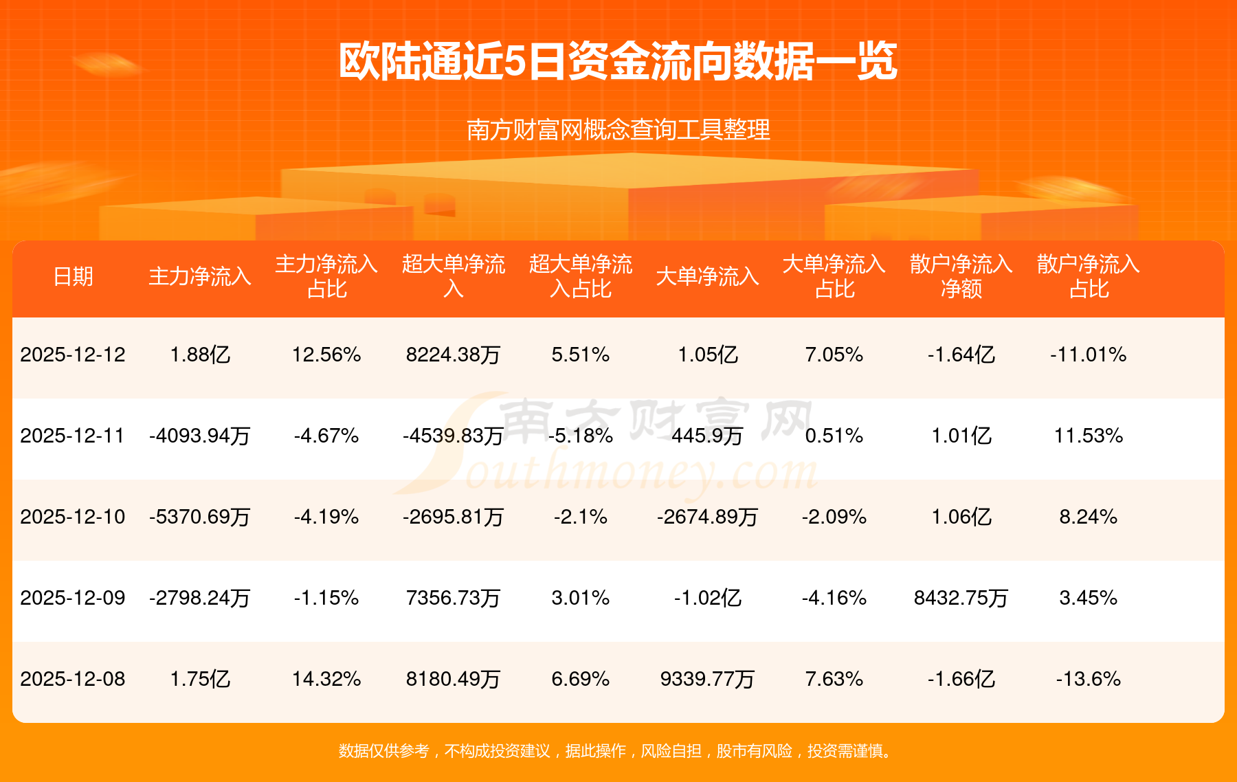 12月12日该股主力净流入1.88亿元,超大单净流入8224.38万元,大单净流入1.05亿元,中单净流出2319.28万元,散户净流出1.64亿元。
