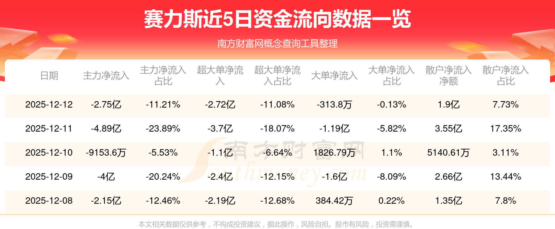 12月12日消息,赛力斯主力净流出2.75亿元,超大单净流出2.72亿元,散户净流入1.9亿元。