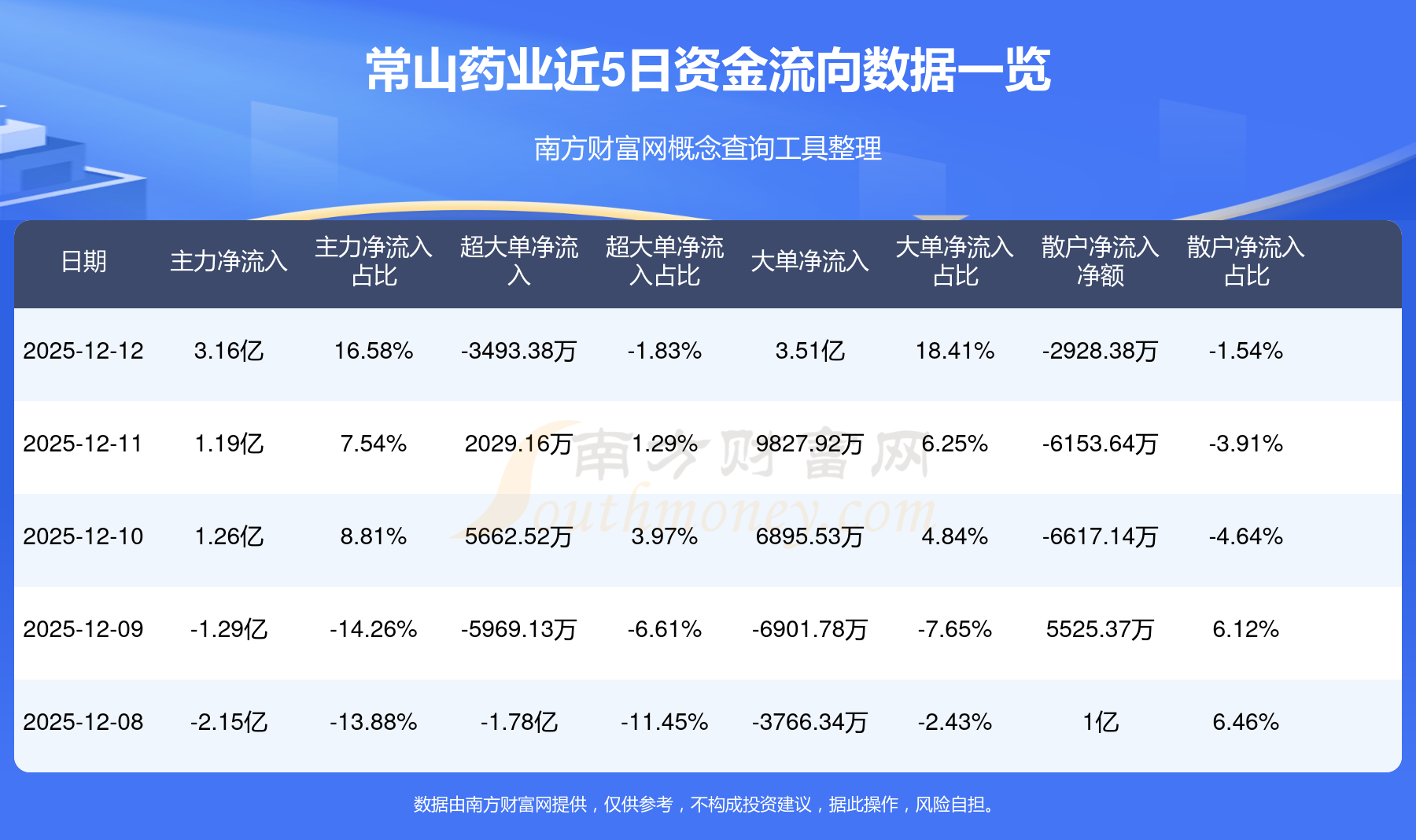 12月12日消息,常山药业资金净流入3.16亿元,超大单资金净流出3493.38万元,换手率1.93%,成交金额12.01亿元。