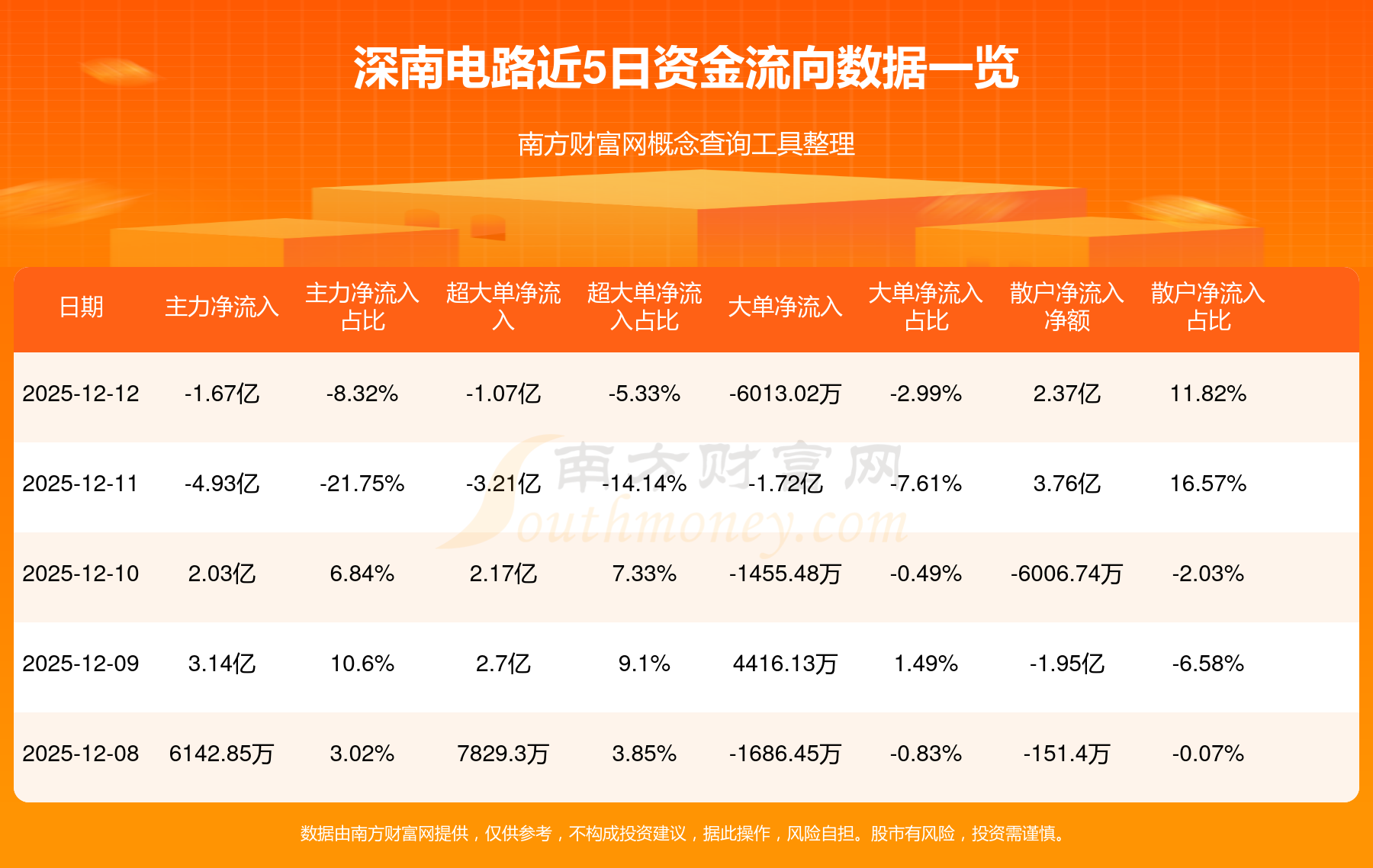 12月12日消息,深南电路12月12日主力净流出1.67亿元,超大单净流出1.07亿元,大单净流出6013.02万元,散户净流入2.37亿元。