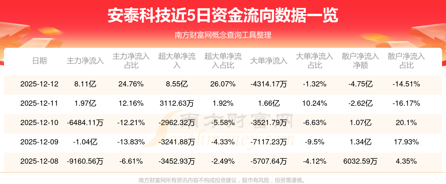 12月12日消息,安泰科技资金净流入8.11亿元,超大单净流入8.55亿元,换手率15.12%,成交金额31.53亿元。