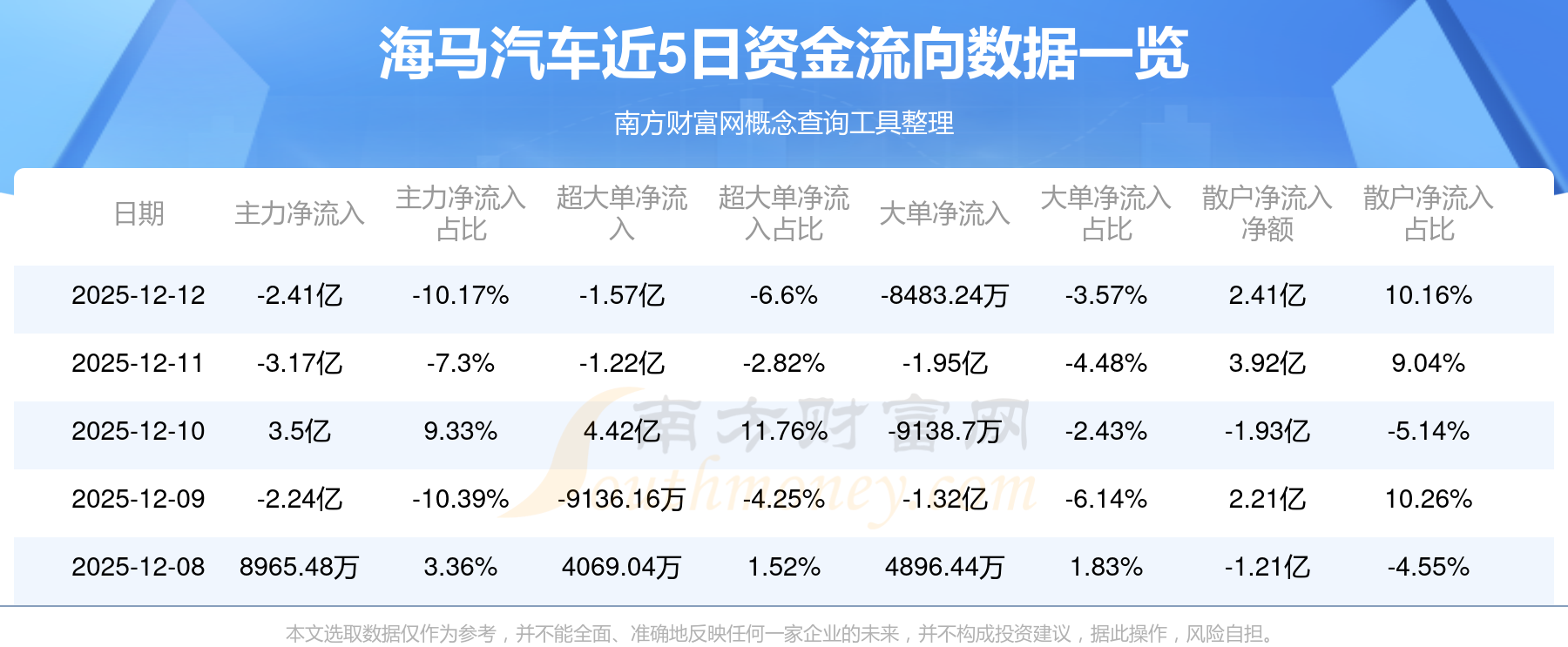 【12月12日】今日海马汽车(000572)主力净流入净额-2.41亿元,占比-10.17%。该股开盘报9.53元,收于9.290元,跌3.88%,总市值为152.79亿元,换手率10.99%。