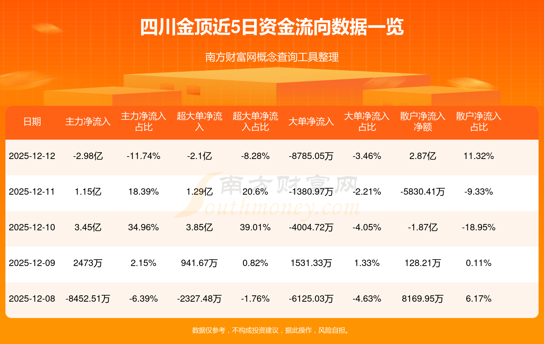 12月12日消息,四川金顶主力净流出2.98亿元,超大单净流出2.1亿元,散户净流入2.87亿元。