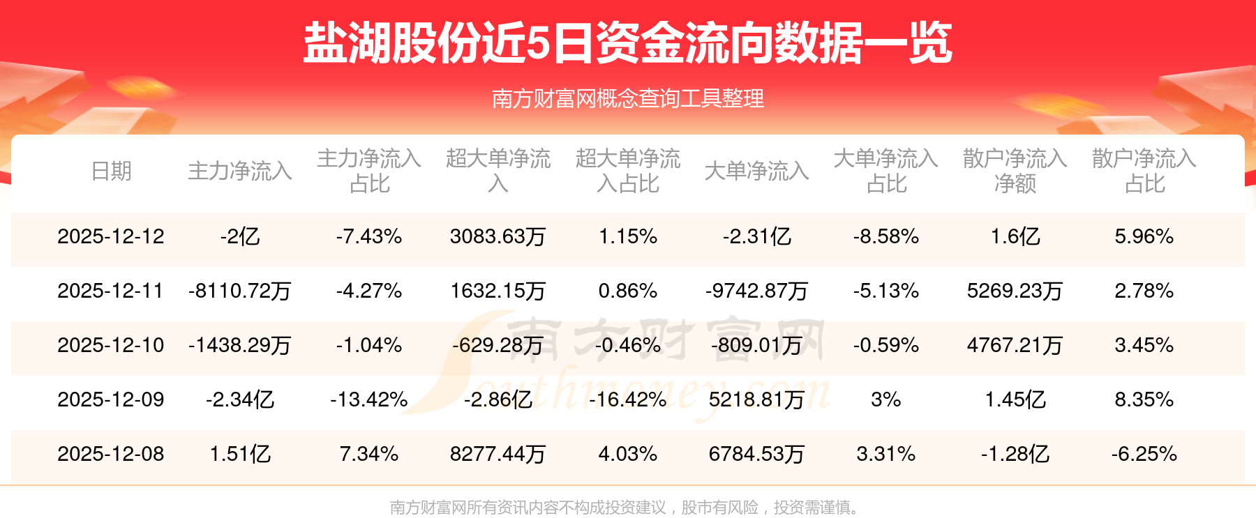 12月12日消息,盐湖股份12月12日主力净流出2亿元,超大单净流入3083.63万元,大单净流出2.31亿元,散户净流入1.6亿元。