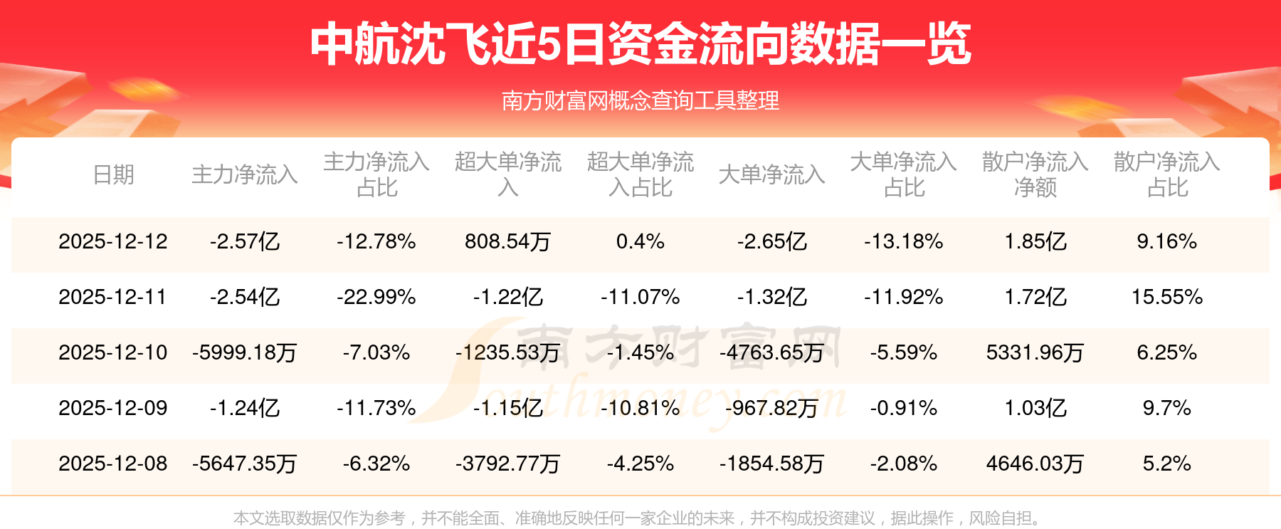12月12日消息,中航沈飞主力资金净流出2.57亿元,超大单资金净流入808.54万元,散户资金净流入1.85亿元。