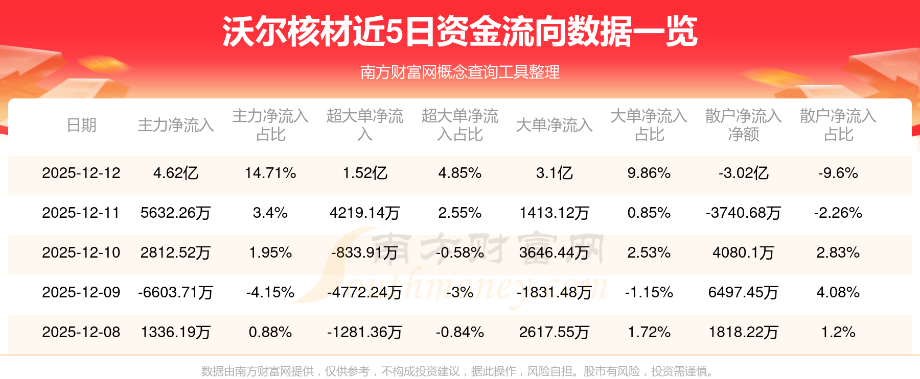 12月12日消息,沃尔核材主力资金净流入4.62亿元,超大单资金净流入1.52亿元,散户资金净流出3.02亿元。