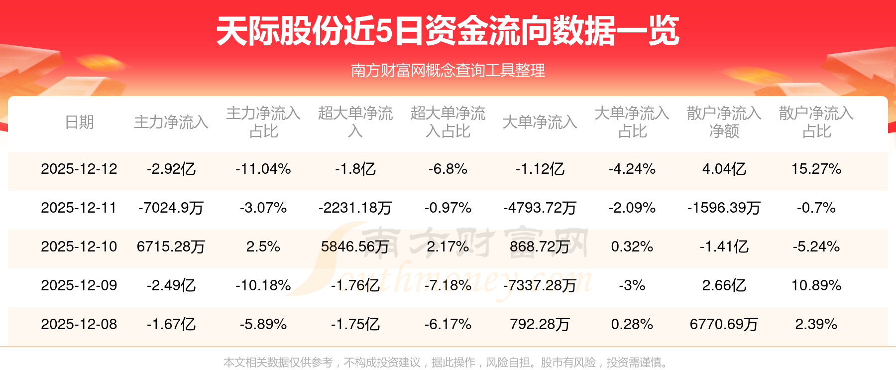 12月12日消息,天际股份12月12日主力资金净流出2.92亿元,超大单资金净流出1.8亿元,大单资金净流出1.12亿元,散户资金净流入4.04亿元。