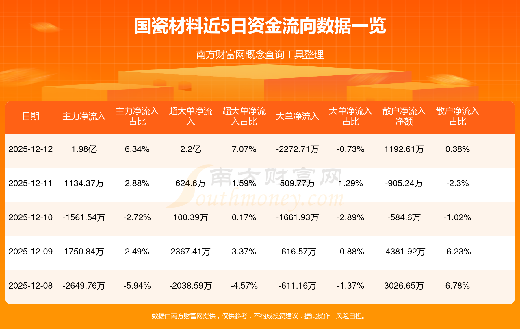 12月12日该股主力资金净流入1.98亿元,超大单资金净流入2.2亿元,大单资金净流出2272.71万元,中单资金净流出2.1亿元,散户资金净流入1192.61万元。