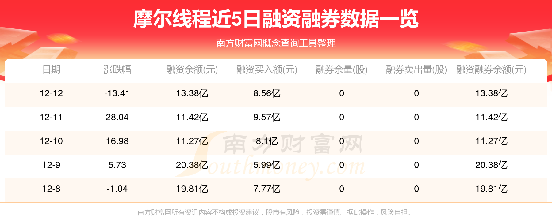 摩尔线程12月12日融券信息显示,融资方面,当日融资买入8.56亿元,融资偿还6.6亿元,融资净买额1.96亿元。近5日融资融券数据一览见下表: