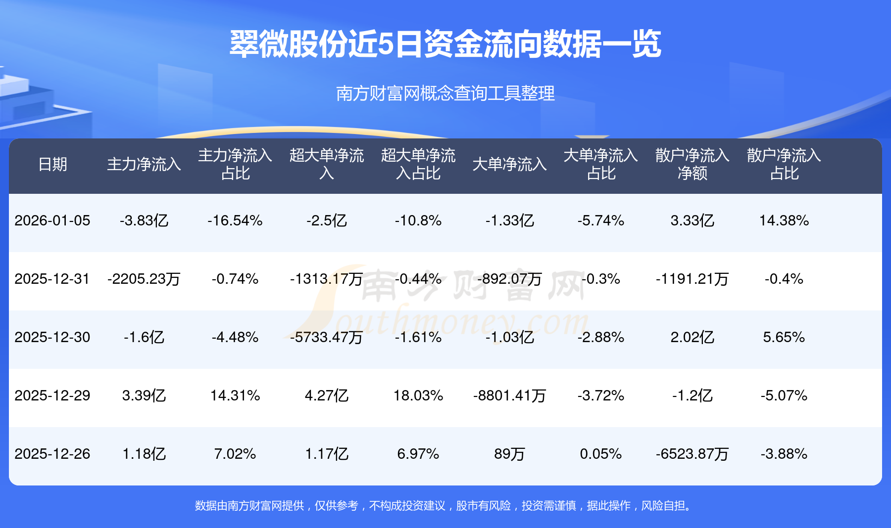 1月5日该股主力资金净流出3.83亿元,超大单资金净流出2.5亿元,大单资金净流出1.33亿元,中单资金净流入4989.11万元,散户资金净流入3.33亿元。