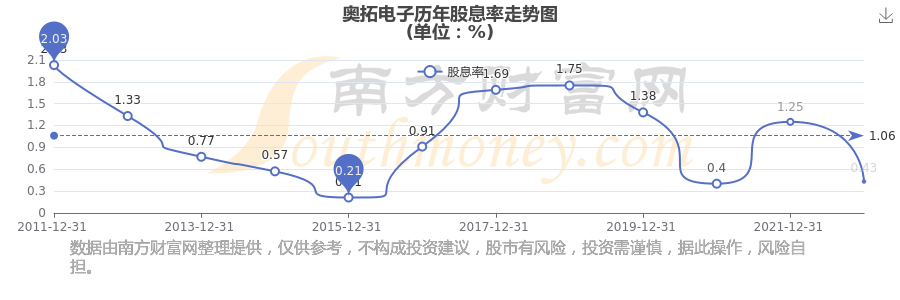 近年奥拓电子年度股息率走势如下图: