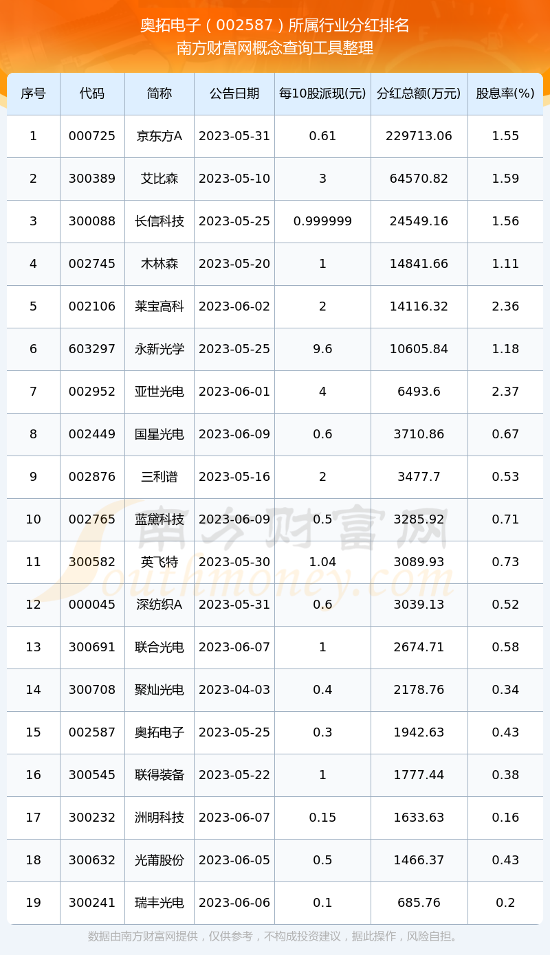 按照南方财富网趋势选股系统统计,奥拓电子所属行业为光学光电子行业,光学光电子行业分红排名情况如下表: