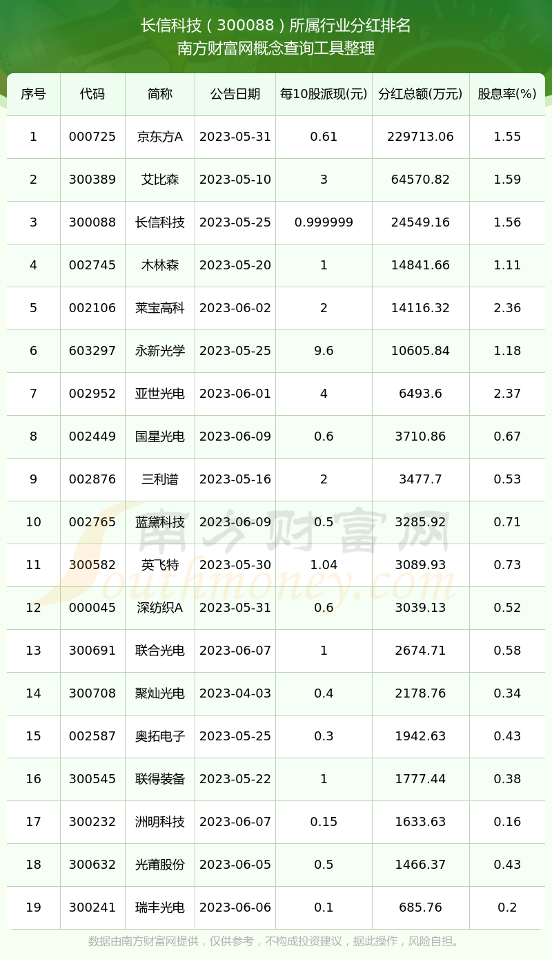 按照南方财富网趋势选股系统统计,长信科技所属行业为光学光电子行业,光学光电子行业分红排名情况如下表: