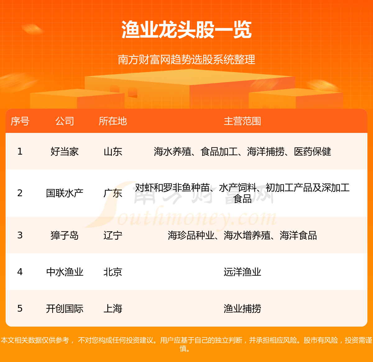 渔业概念股有通威股份、益生股份、傲农生物、国联水产、中水渔业、好当家、大湖股份、獐子岛、开创国际、*ST东洋等11家上市公司。渔业龙头股是哪几只?趋势选股系统为您整理渔业龙头股的相关信息。