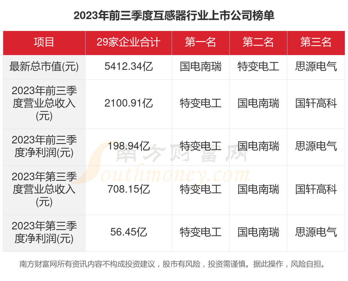 根据南方财富网概念查询工具数据统计,2023年前三季度,A股29家互感器行业上市公司的2023年前三季度营业收入合计为2100.91亿元,同比增长11.98%。其中,2023年前三季度营业收入前三的互感器行业上市公司为:特变电工、国电南瑞、国轩高科。