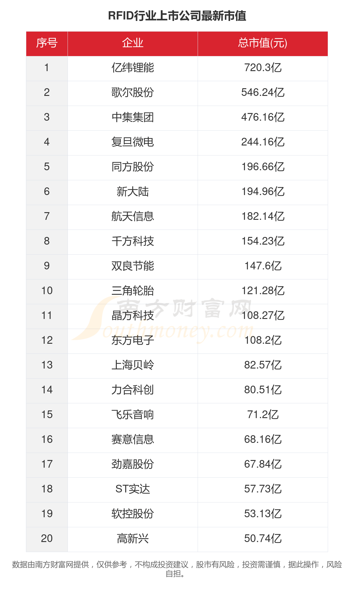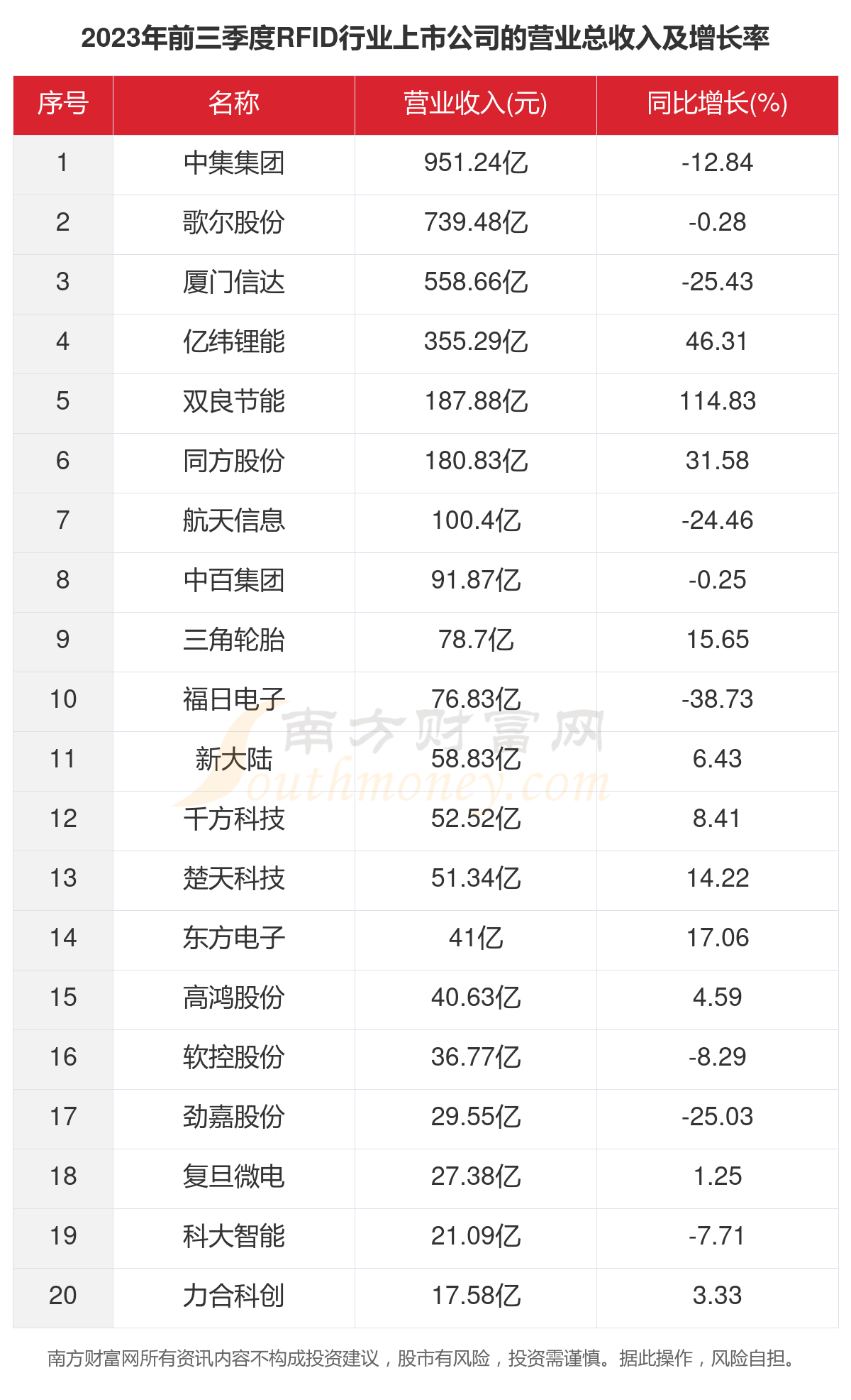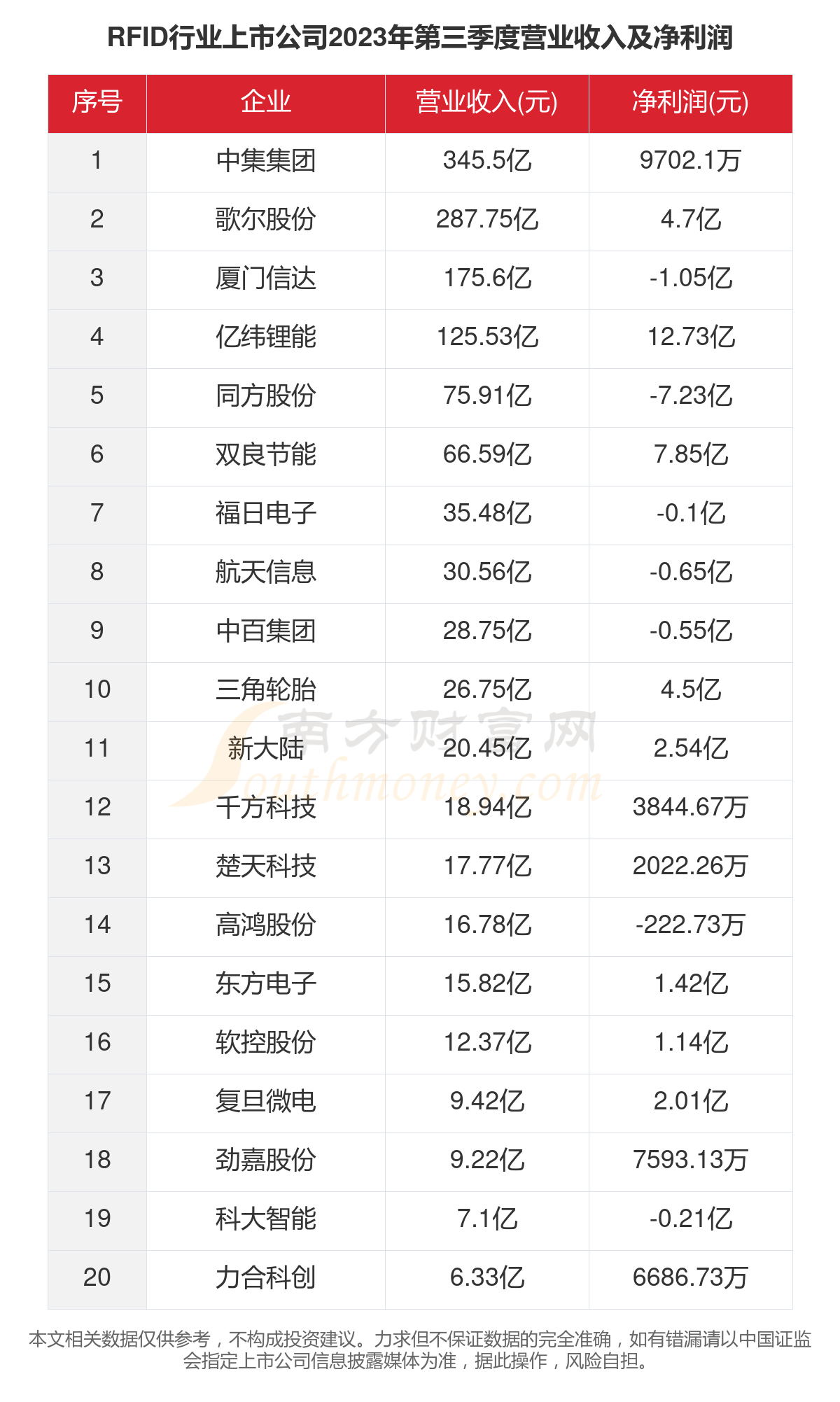 根据南方财富网概念查询工具数据统计,2023年前三季度,43家RFID行业上市公司的2023年前三季度归属净利润合计为99.6亿元,同比减少-30.15%。其中,2023年前三季度归属净利润前三的RFID行业上市公司为:亿纬锂能、双良节能、三角轮胎。