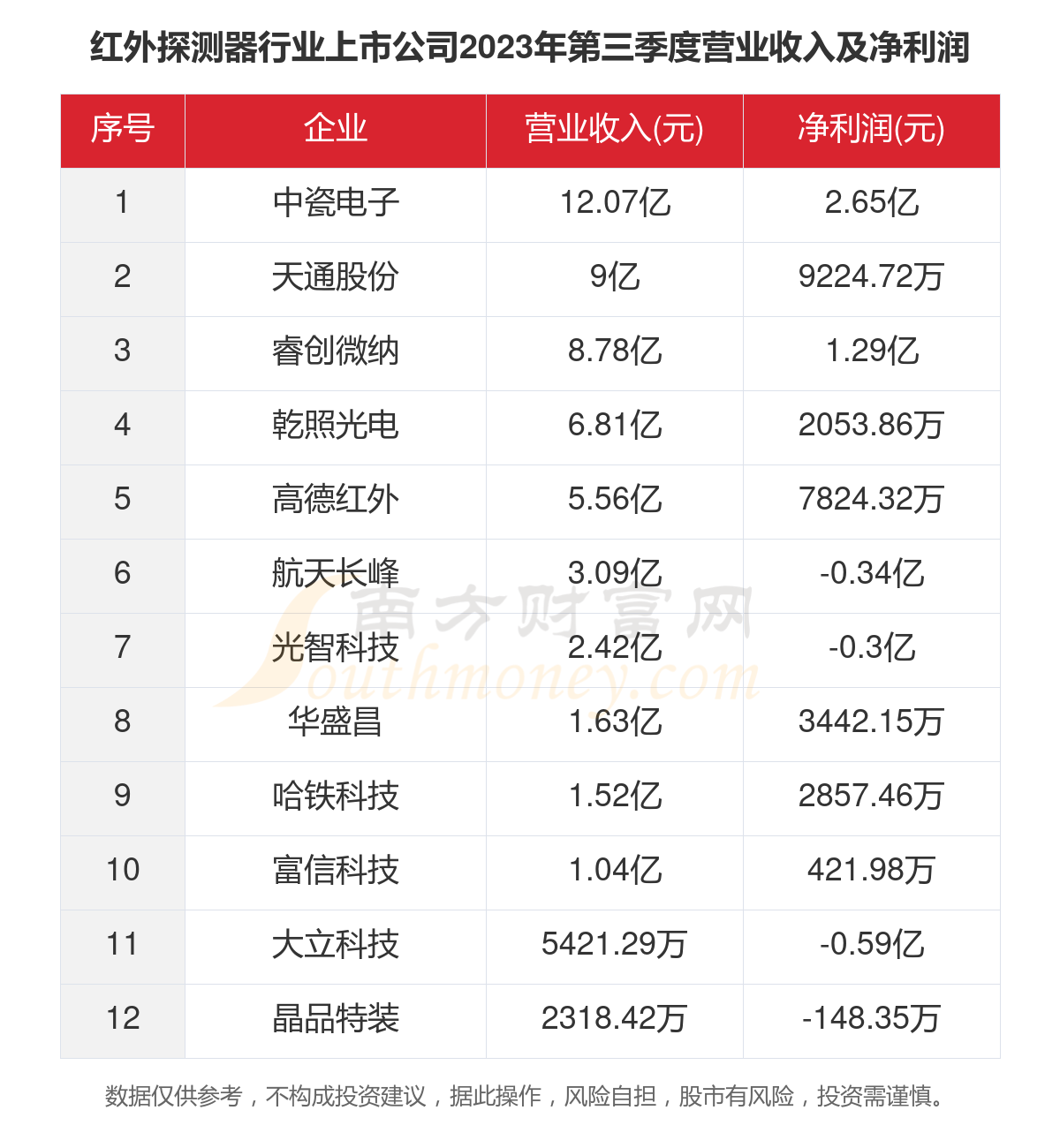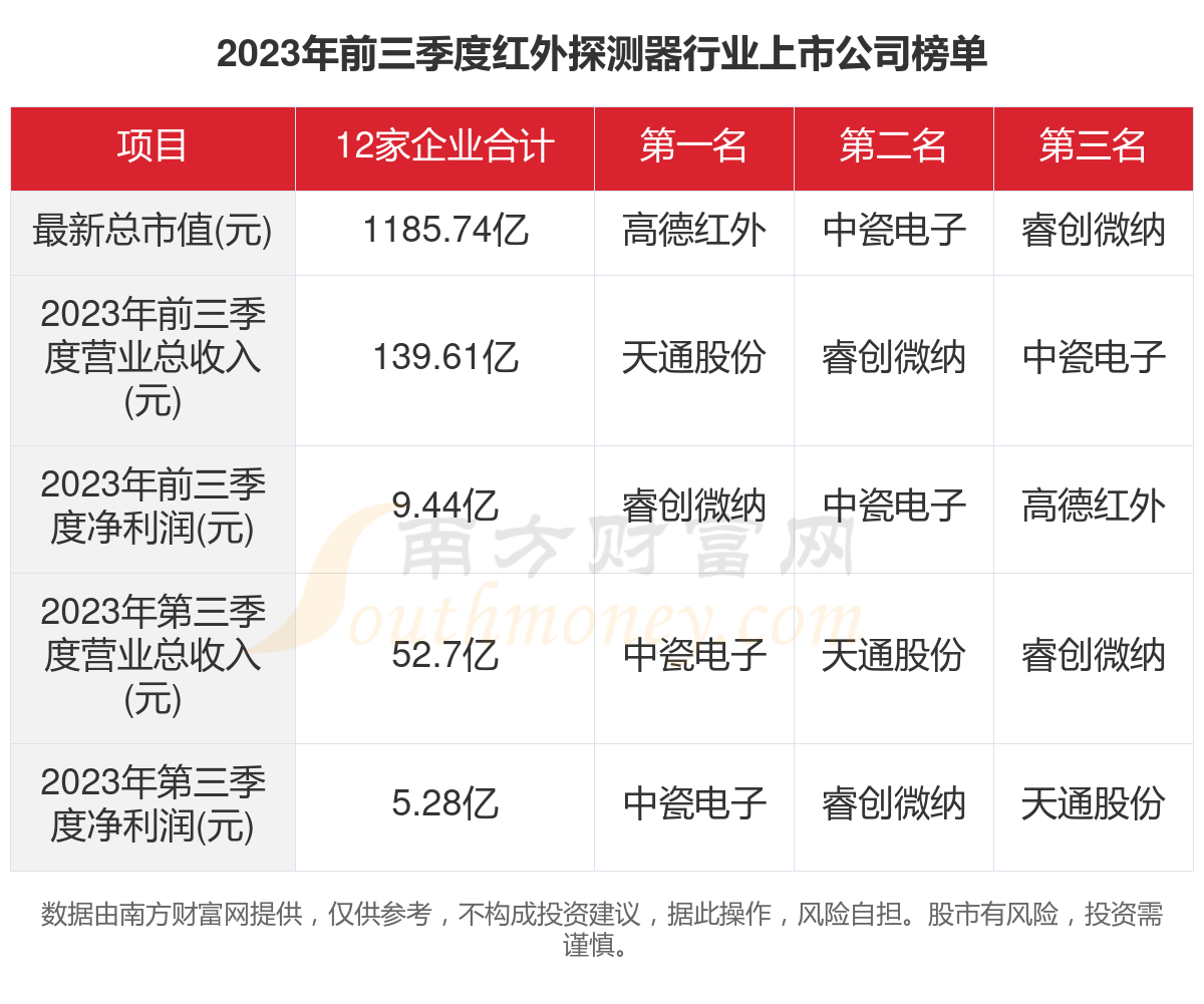 本文统计了A股12家红外探测器行业上市公司的2023年前三季度的营业收入、净利润,2023年第三季度的营业收入、净利润,以及最新的市值情况。