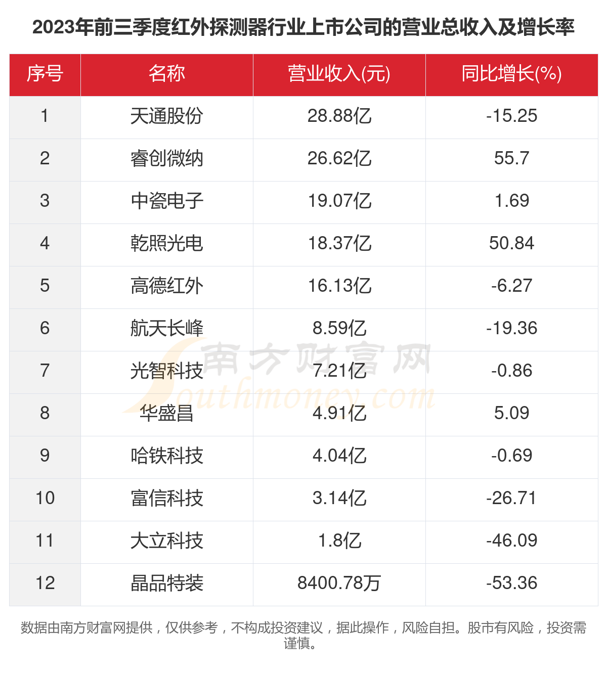 根据南方财富网概念查询工具数据统计,2023年第三季度,A股12家红外探测器行业上市公司的季度营业收入合计为52.7亿元,净利润合计为5.28亿元。