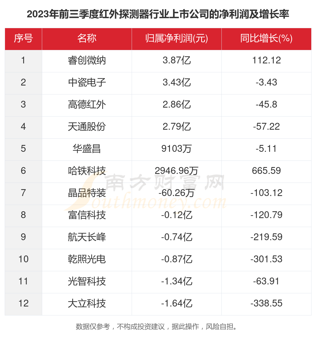 根据南方财富网概念查询工具数据统计,2023年前三季度,12家红外探测器行业上市公司的2023年前三季度归属净利润合计为9.44亿元,同比减少-45.09%。其中,2023年前三季度归属净利润前三的红外探测器行业上市公司为:睿创微纳、中瓷电子、高德红外。