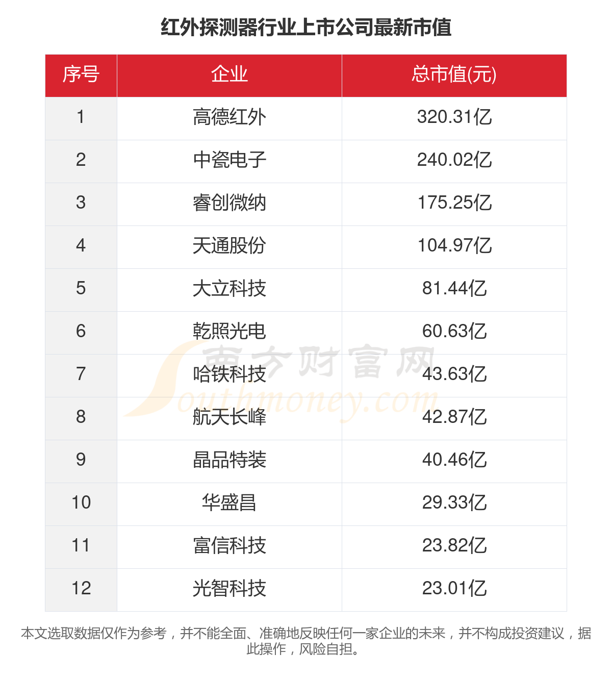 根据3月15日的收盘价格,A股12家红外探测器行业上市公司的当前总市值合计为1185.74亿元。其中,市值最高的三家红外探测器行业上市公司为:高德红外、中瓷电子、睿创微纳。