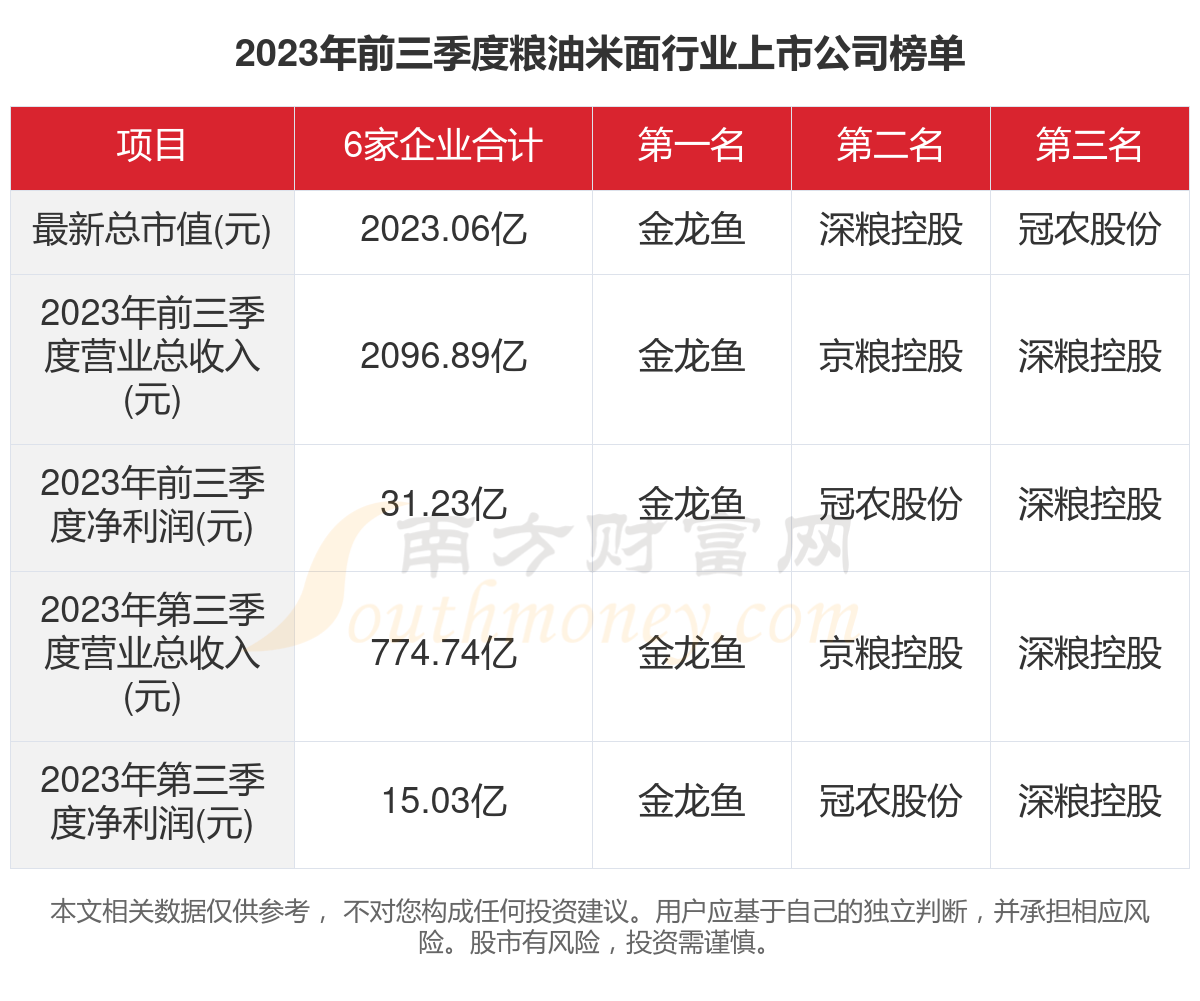 本文统计了A股6家粮油米面行业上市公司的2023年前三季度的营业收入、净利润,2023年第三季度的营业收入、净利润,以及最新的市值情况。