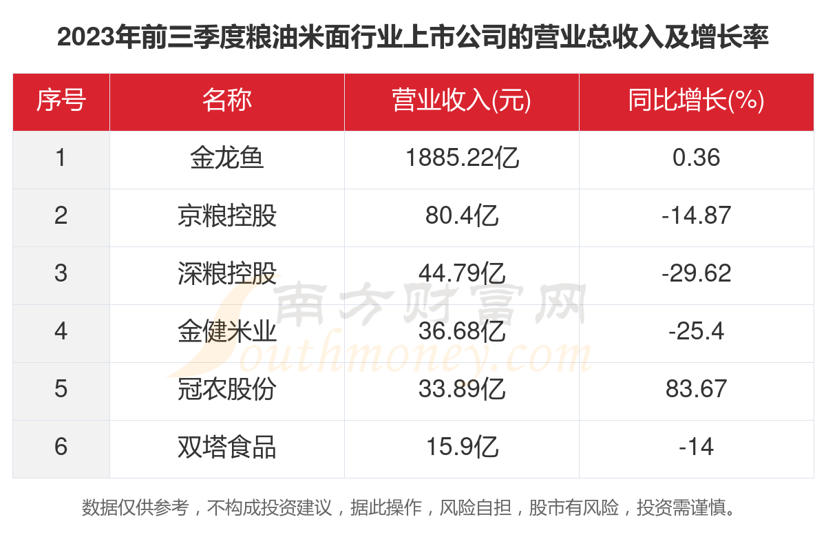 其中,2023年第三季度营业收入前三的粮油米面行业上市公司为:金龙鱼、京粮控股、深粮控股。