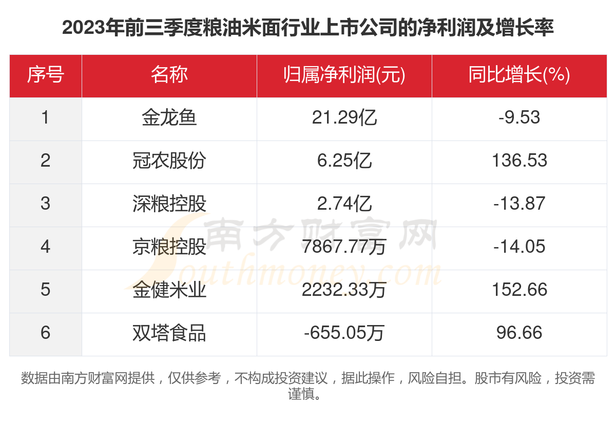 根据南方财富网概念查询工具数据统计,2023年前三季度,6家粮油米面行业上市公司的2023年前三季度归属净利润合计为31.23亿元,同比增长11.98%。其中,2023年前三季度归属净利润前三的粮油米面行业上市公司为:金龙鱼、冠农股份、深粮控股。